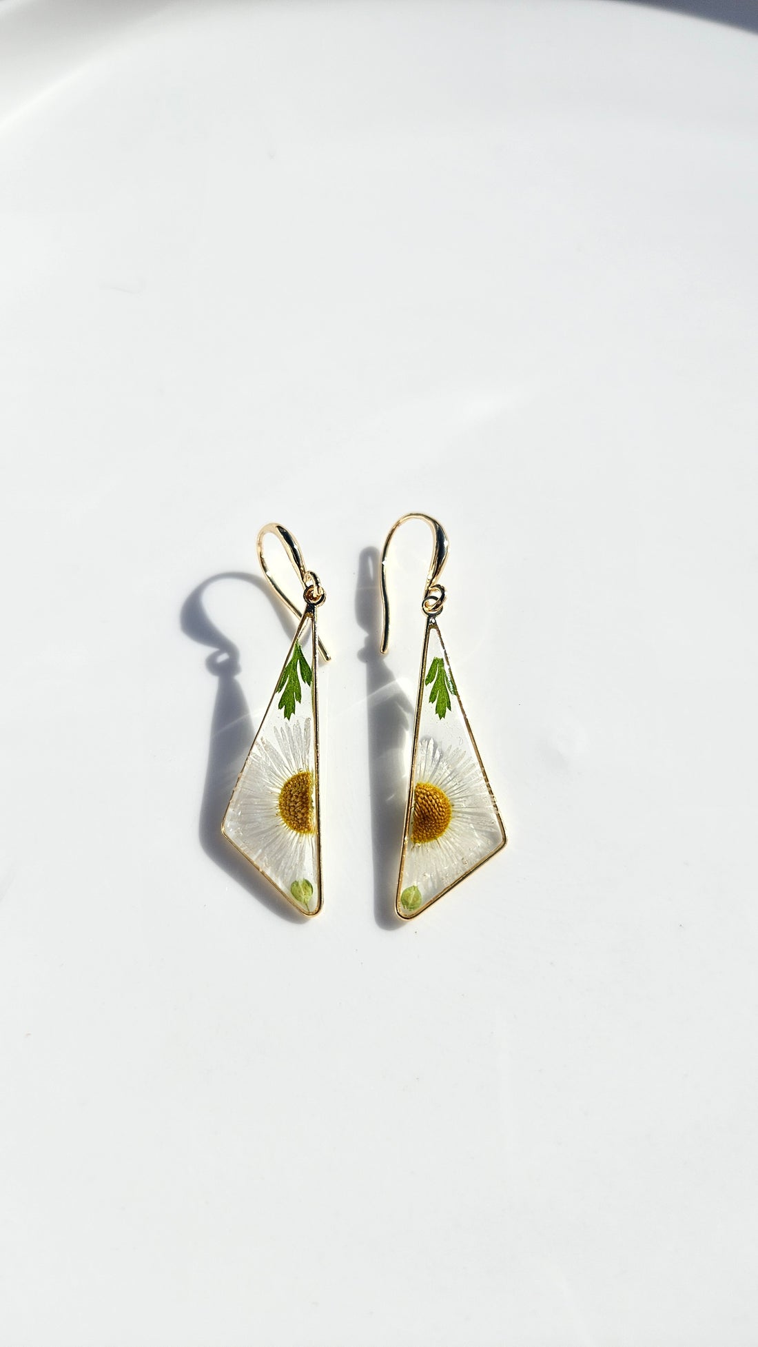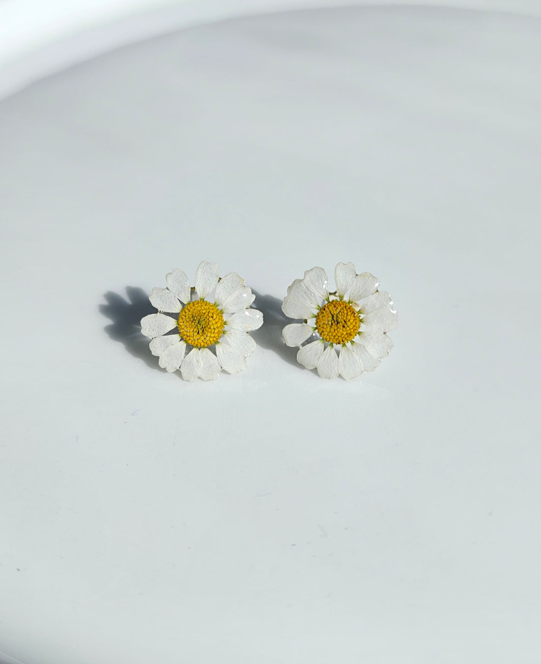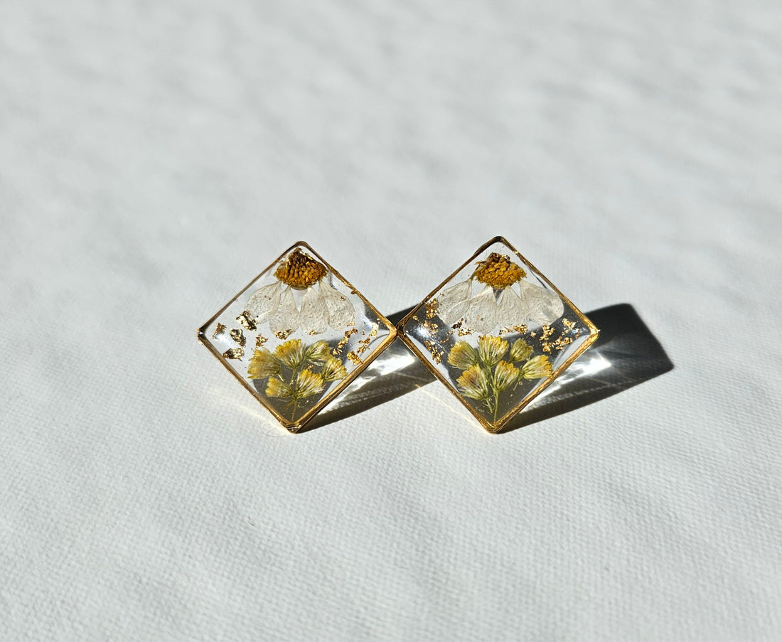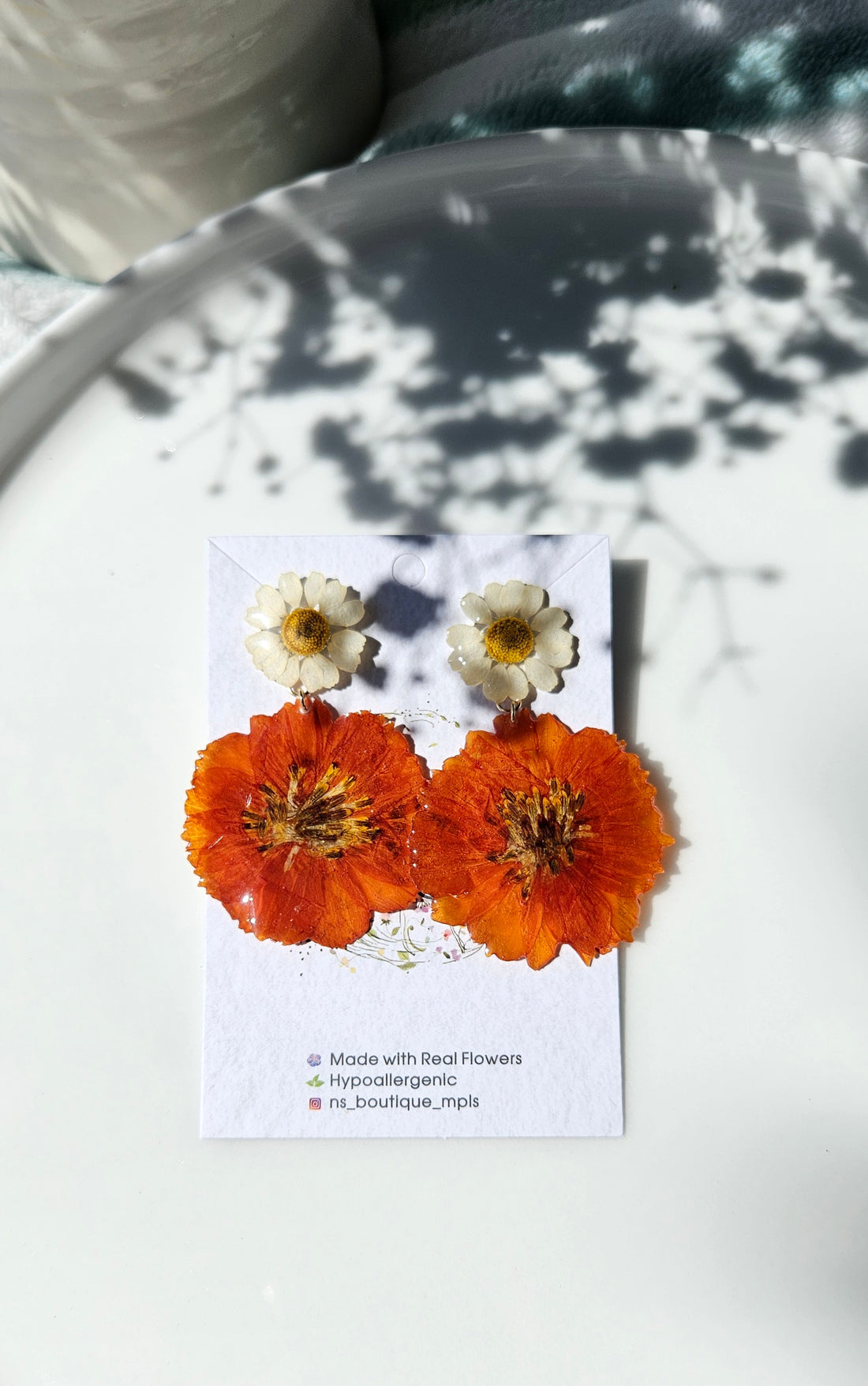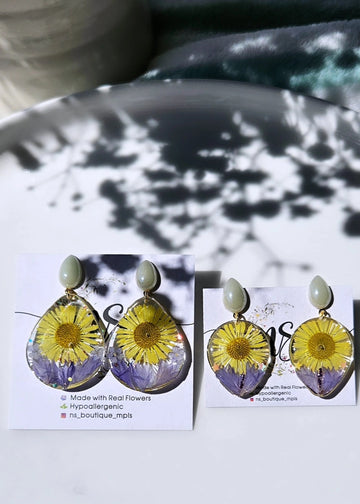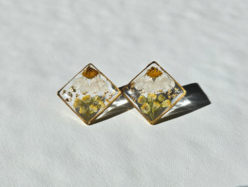 -Real cosmos accented with chamomile preserved in high-quality resin. Finished with sterling silver posts. Available...
