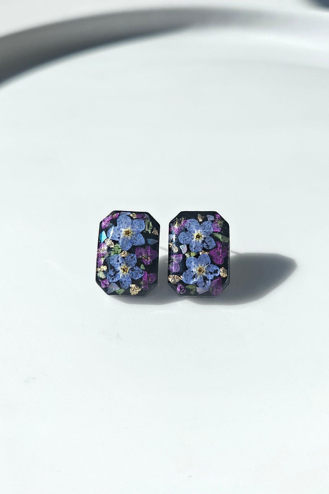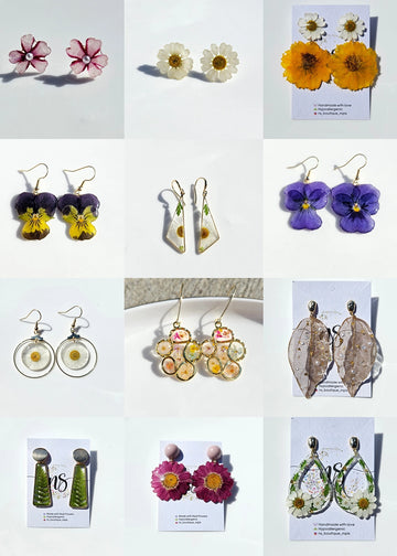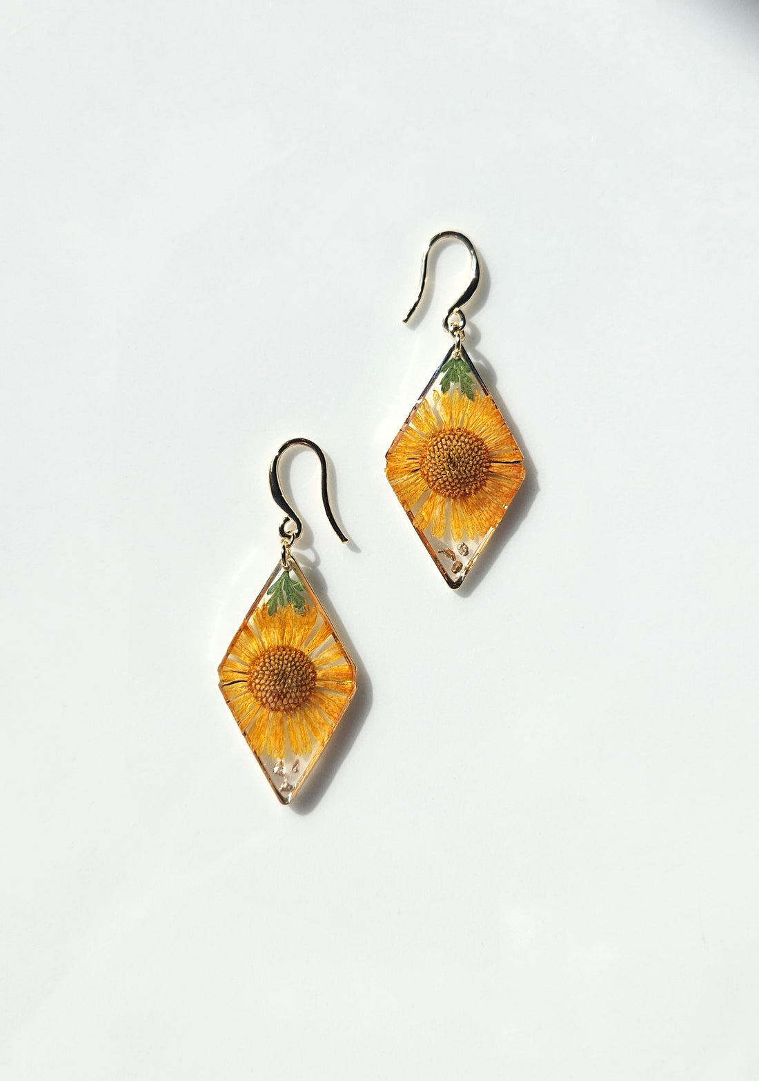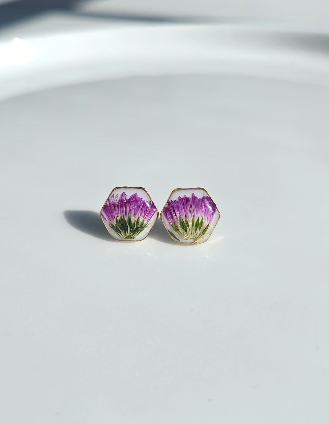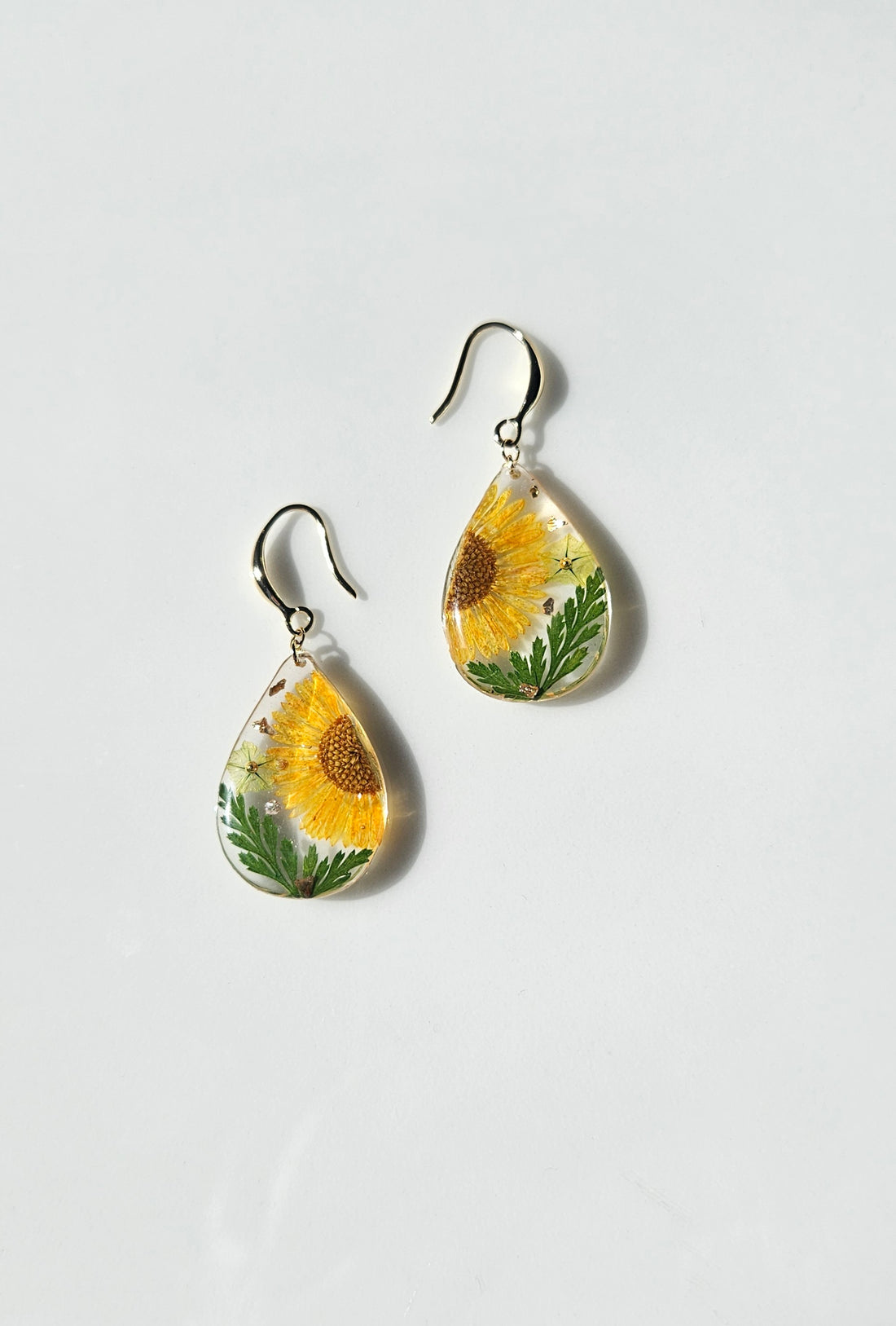 -Real cosmos accented with chamomile preserved in high-quality resin. Finished with sterling silver posts. Available...