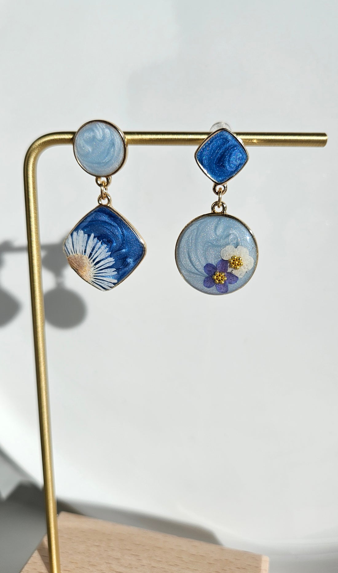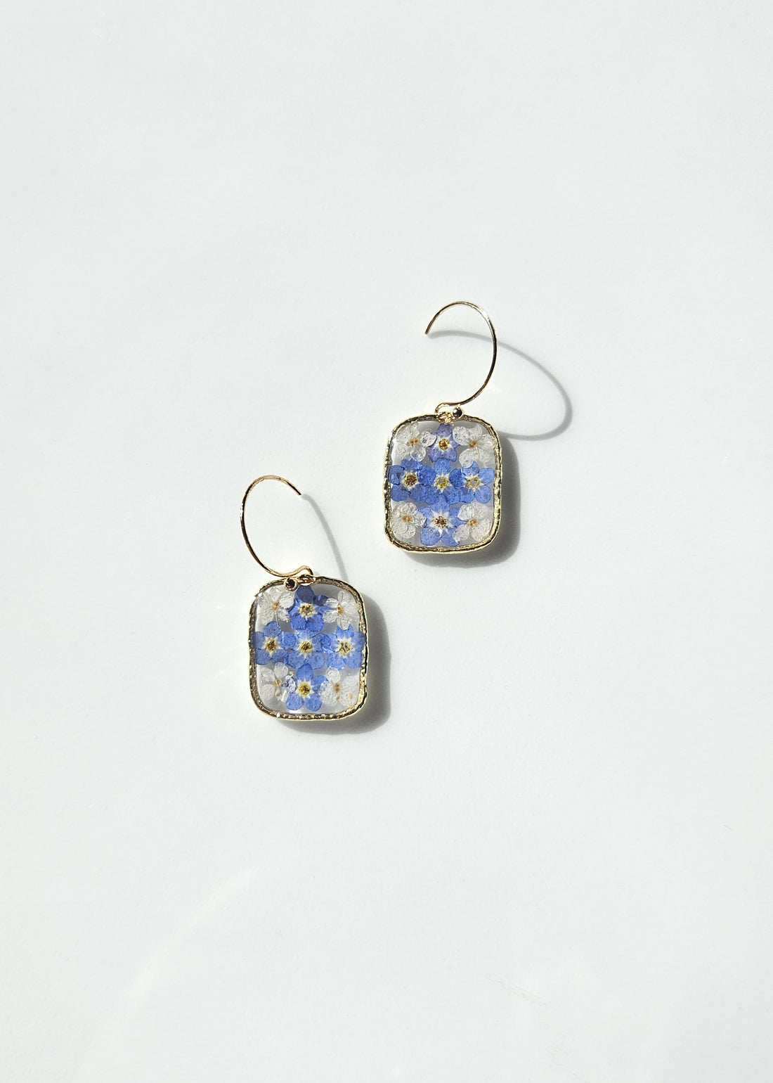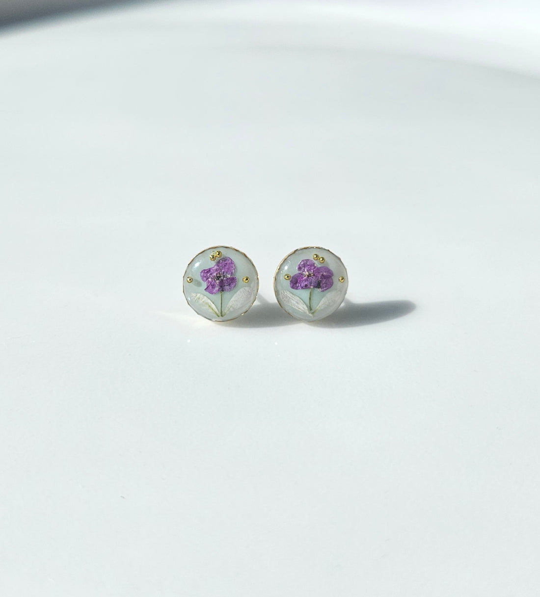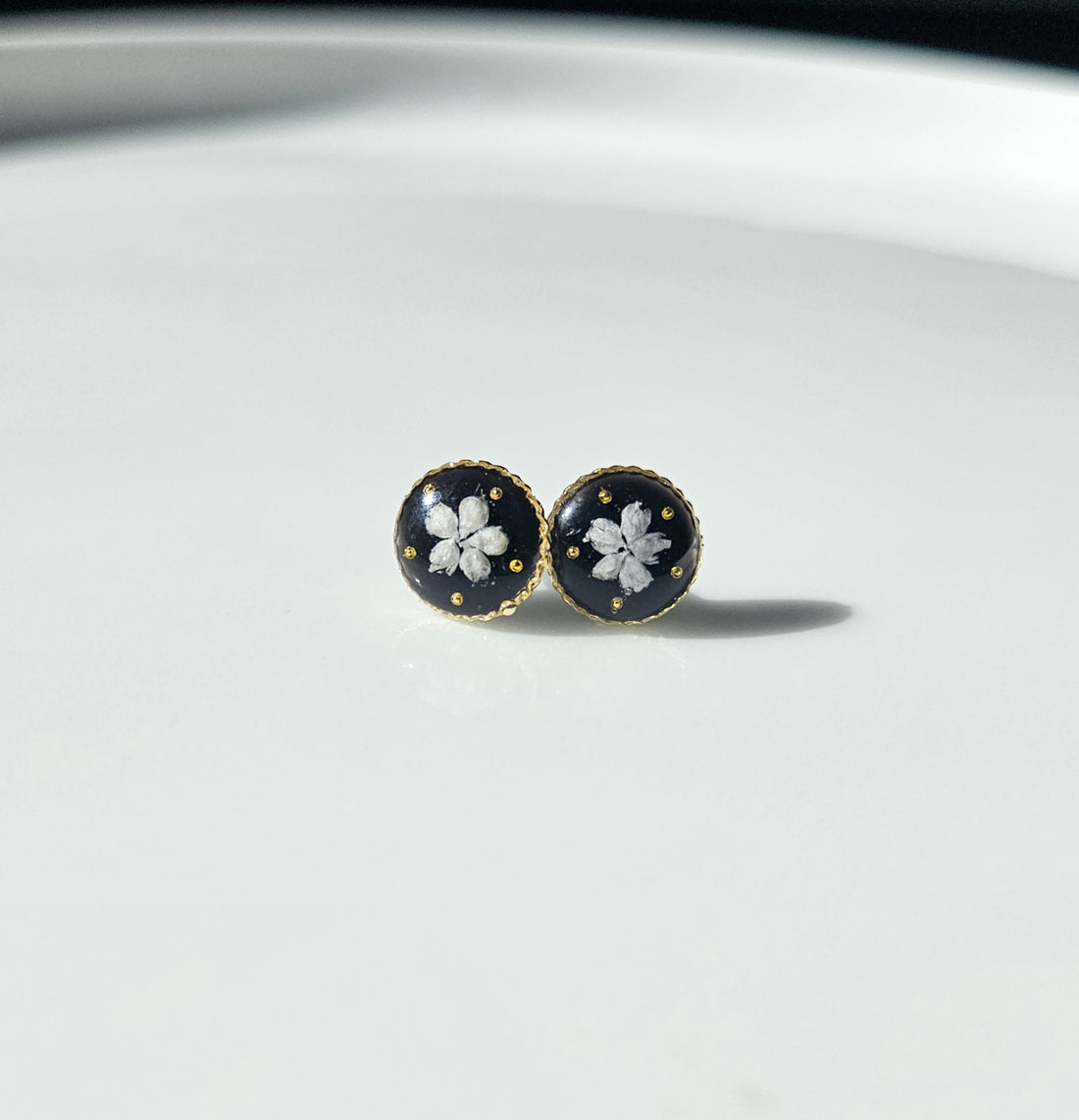 -Real cosmos accented with chamomile preserved in high-quality resin. Finished with sterling silver posts. Available...