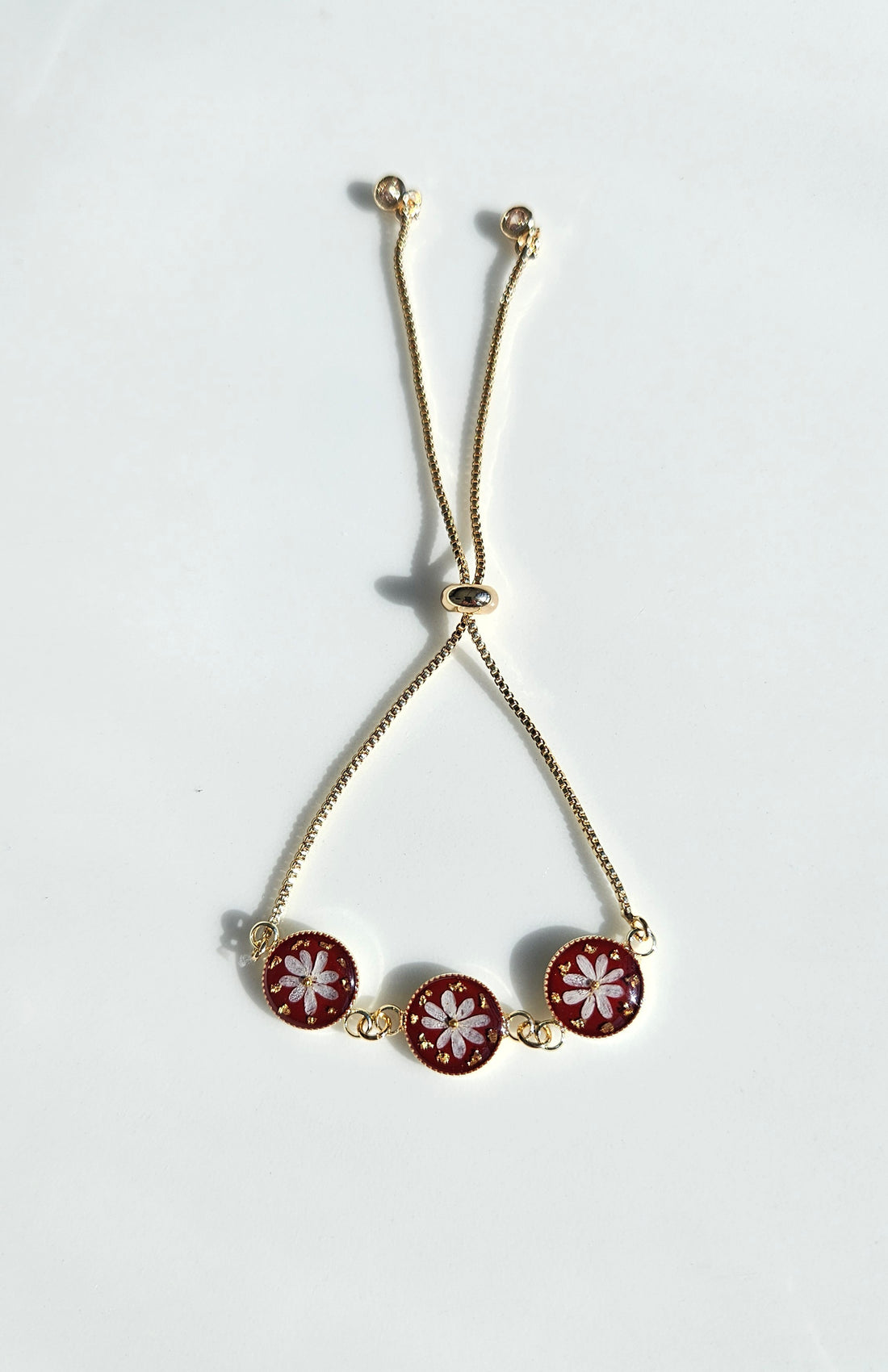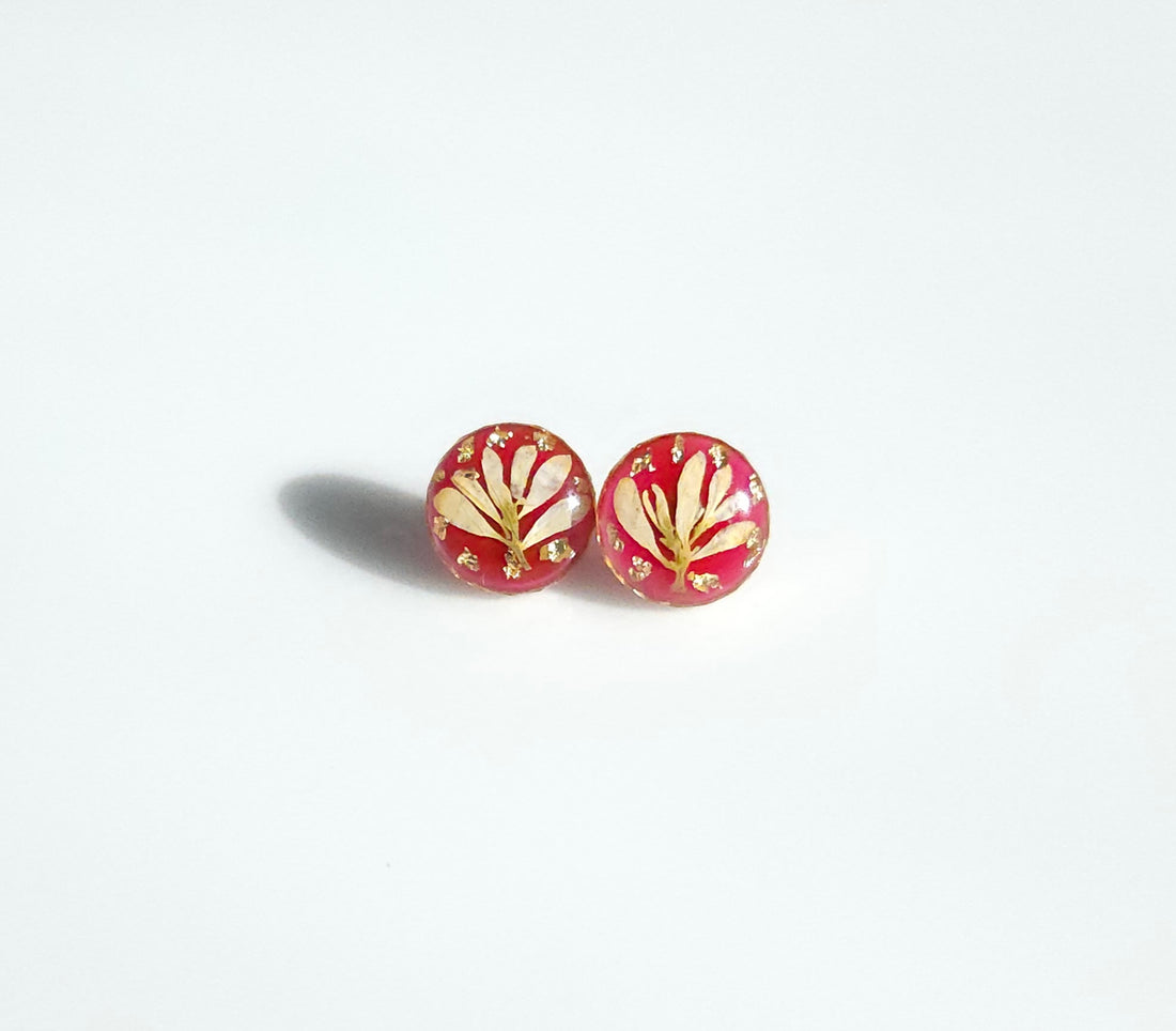 -Real glossy abelia set against a hand-painted red background, preserved in high-quality resin within gold-plated...