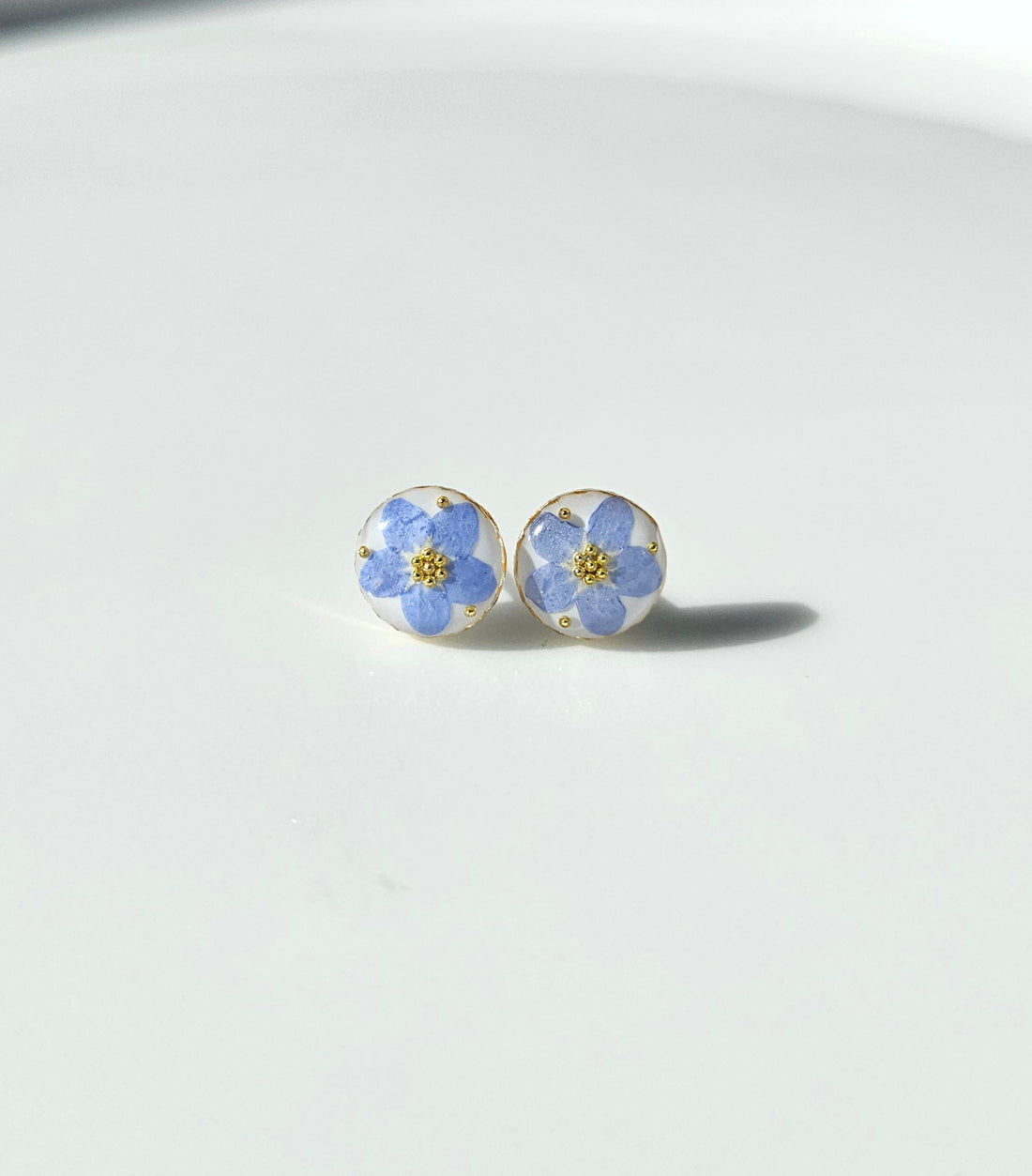 -Real forget me not set against a hand-painted white background, preserved in high-quality resin within...