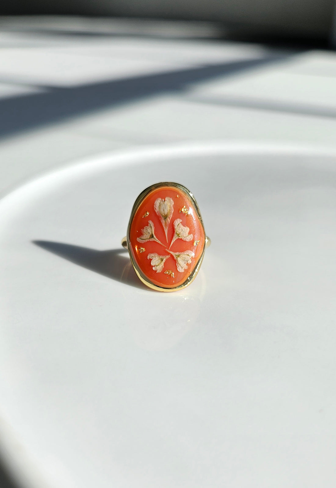 -Real Coriander flower set against a hand-painted red background, preserved in high-quality resin within gold-plated...