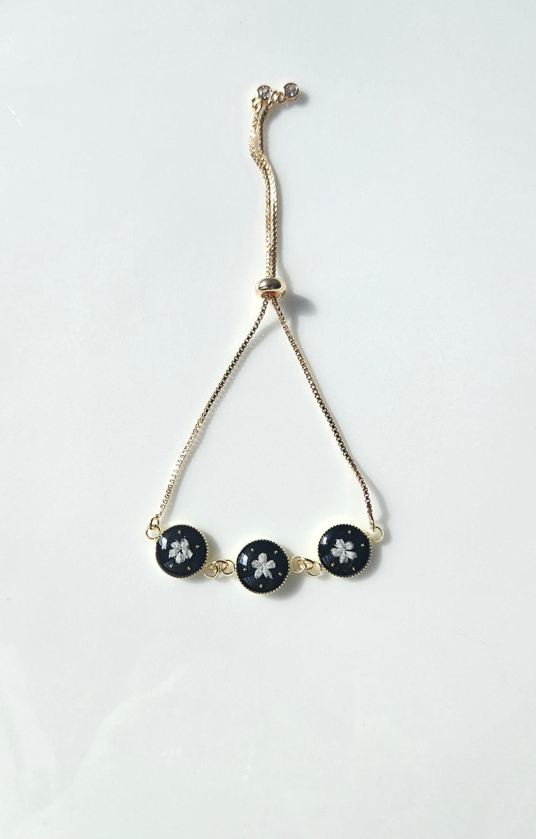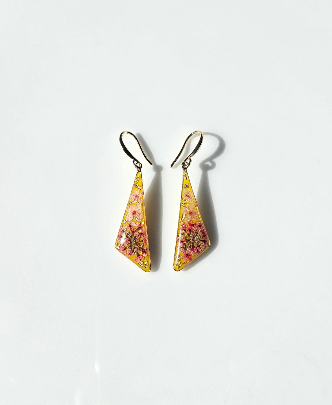 -Real Lace Flower paired with didiscus and yellow petal, set on gold plated triangular bezels...