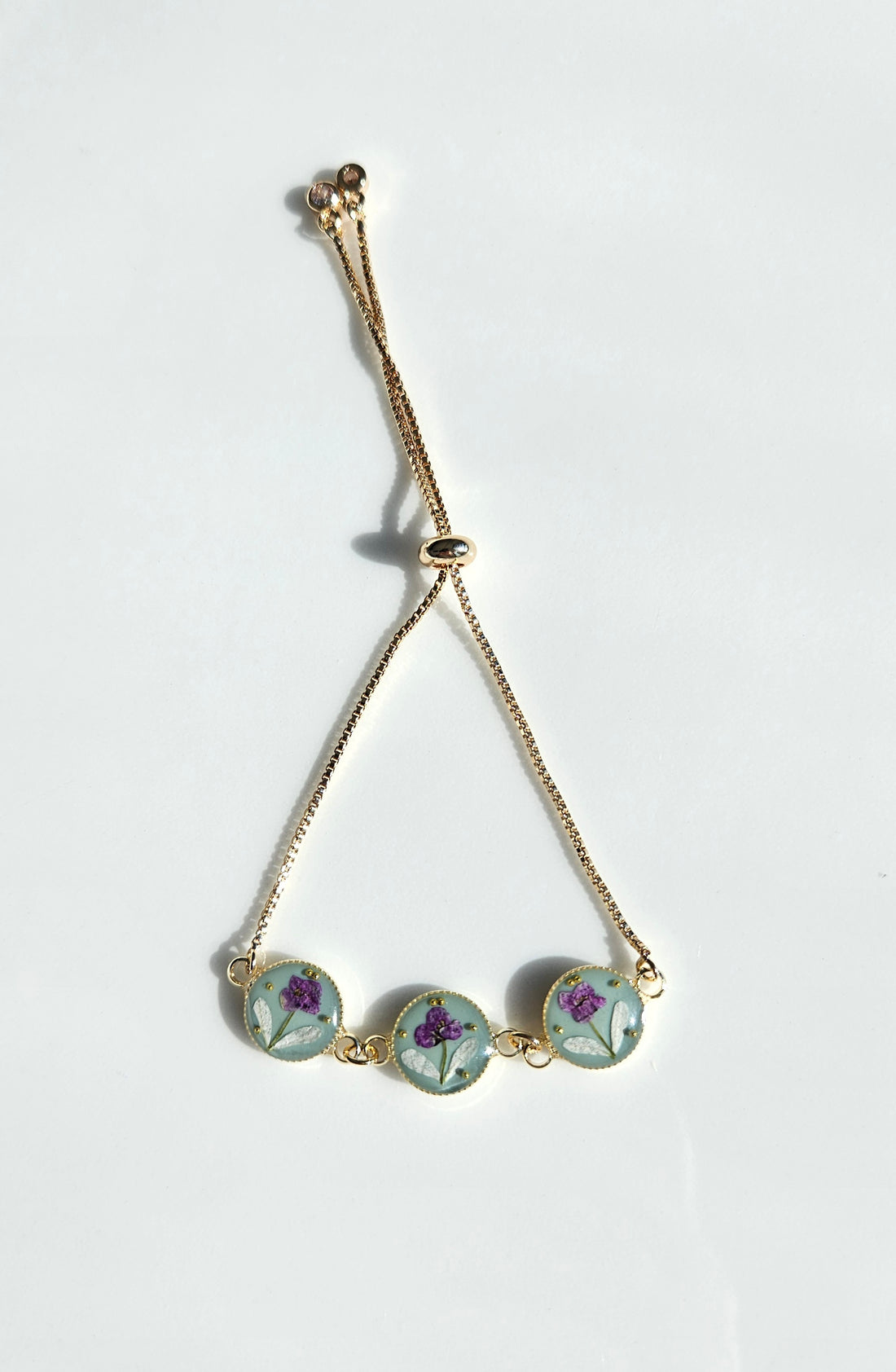-Real fleabane paired with fern, set on gold plated triangular bezels and preserved in high-quality...